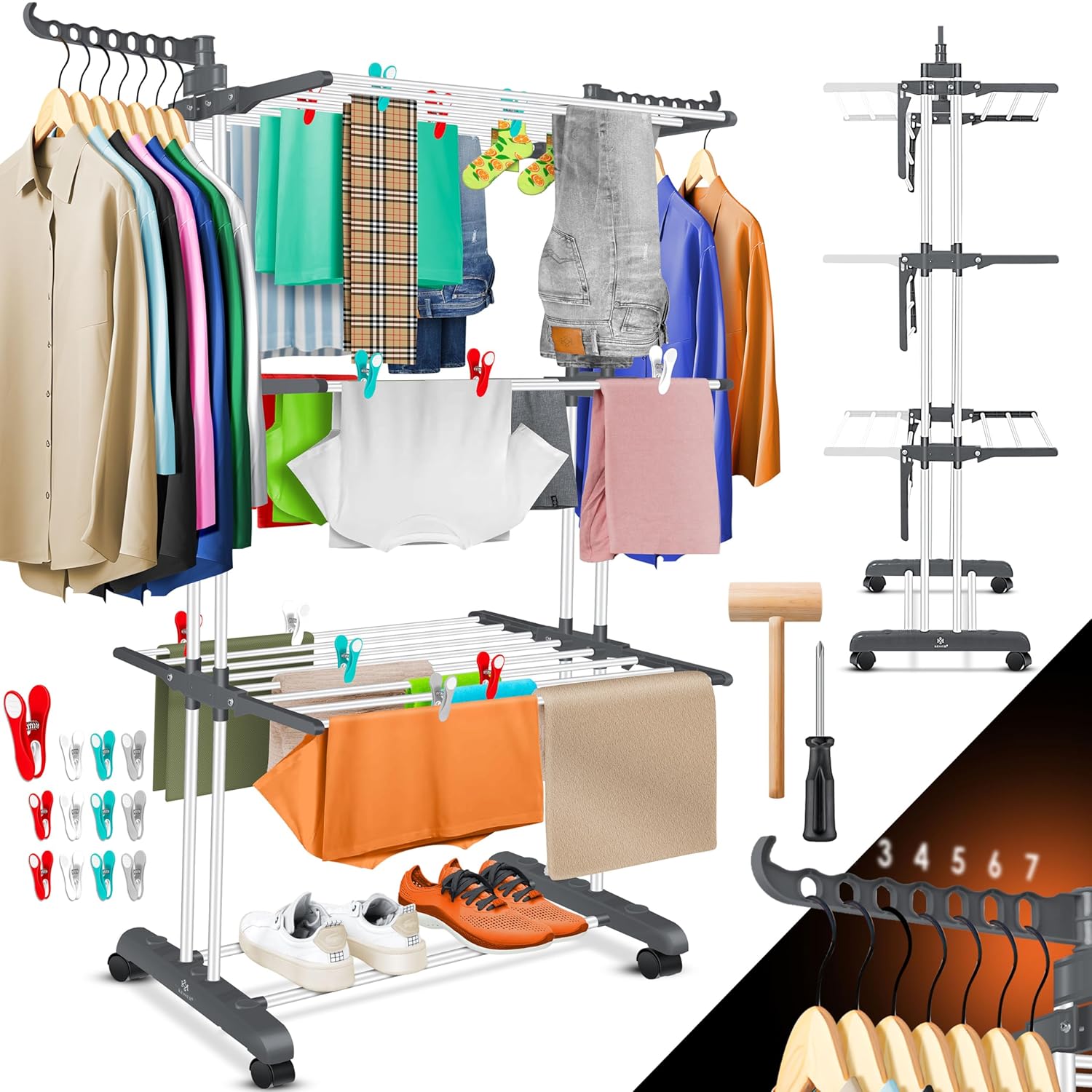 | Lieferumfang | Wäscheständer, 12 farbige Wäscheklammern, 360°‑Rollen mit Bremse |